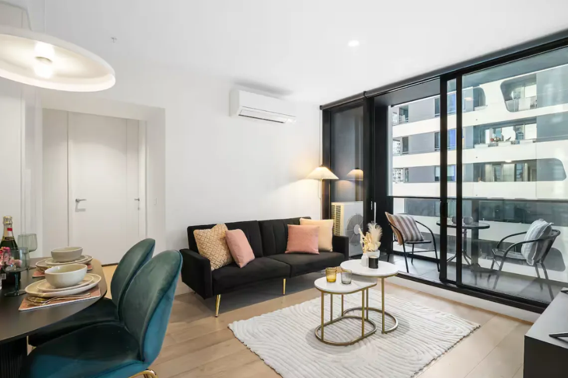 Set high above Melbourne’s skyline, this bold and beautiful apartment combines striking design with hotel-style comfort. Floor-to-ceiling windows showcase sweeping city views, while premium amenities and curated art make every stay a statement of style, sophistication, and ease perfect for travellers who want the best of both worlds.